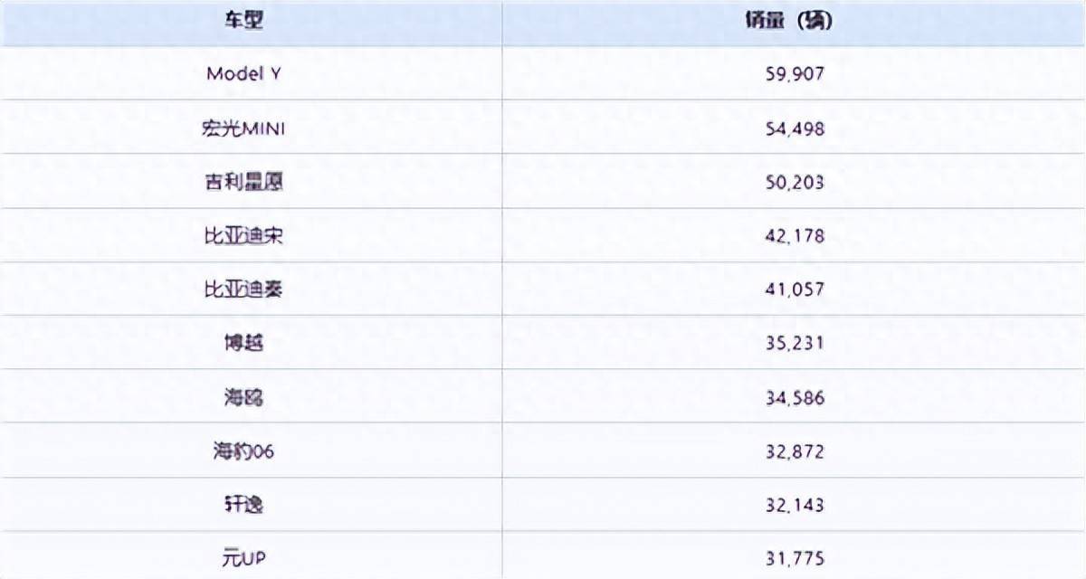 榜单头部呈现出一道有趣的分水岭:特斯拉Model Y以59,907辆的成绩摘得桂冠,而位列第二的五菱宏光MINI EV也卖出了54,498辆。不过,这两款车的价格却天差地别——Model Y的起步价(26.35万元)足以买下5辆顶配的五菱宏光MINI EV(5.08万元)。Model Y也由此成为前十中唯一均价超过20万元的车型。