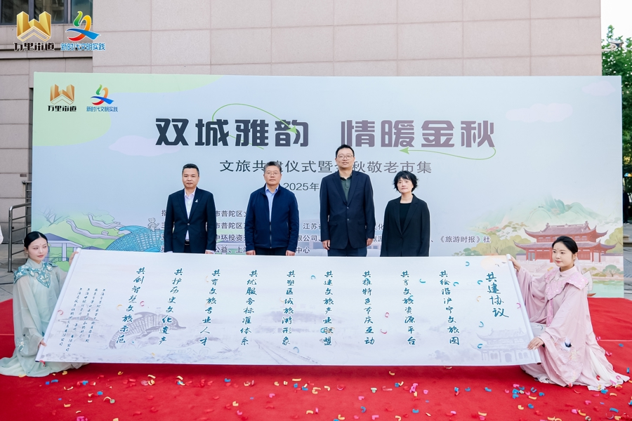10月25日,以“双城雅韵,情暖金秋”为主题的文旅合作启动仪式暨金秋敬老市集在上海市普陀区万里街道中环国际酒店广场举行。普陀万里和南京溧水开启两地文旅共建、资源共享、优势互补的全新局面。